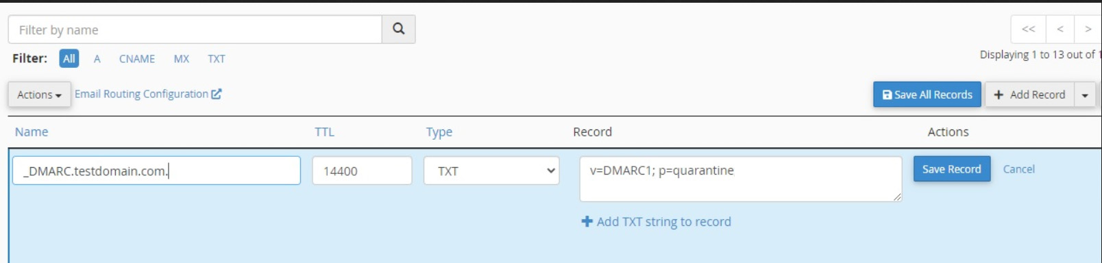 3. From Add Record dropdown button, choose Add "TXT" record and enter the values below.